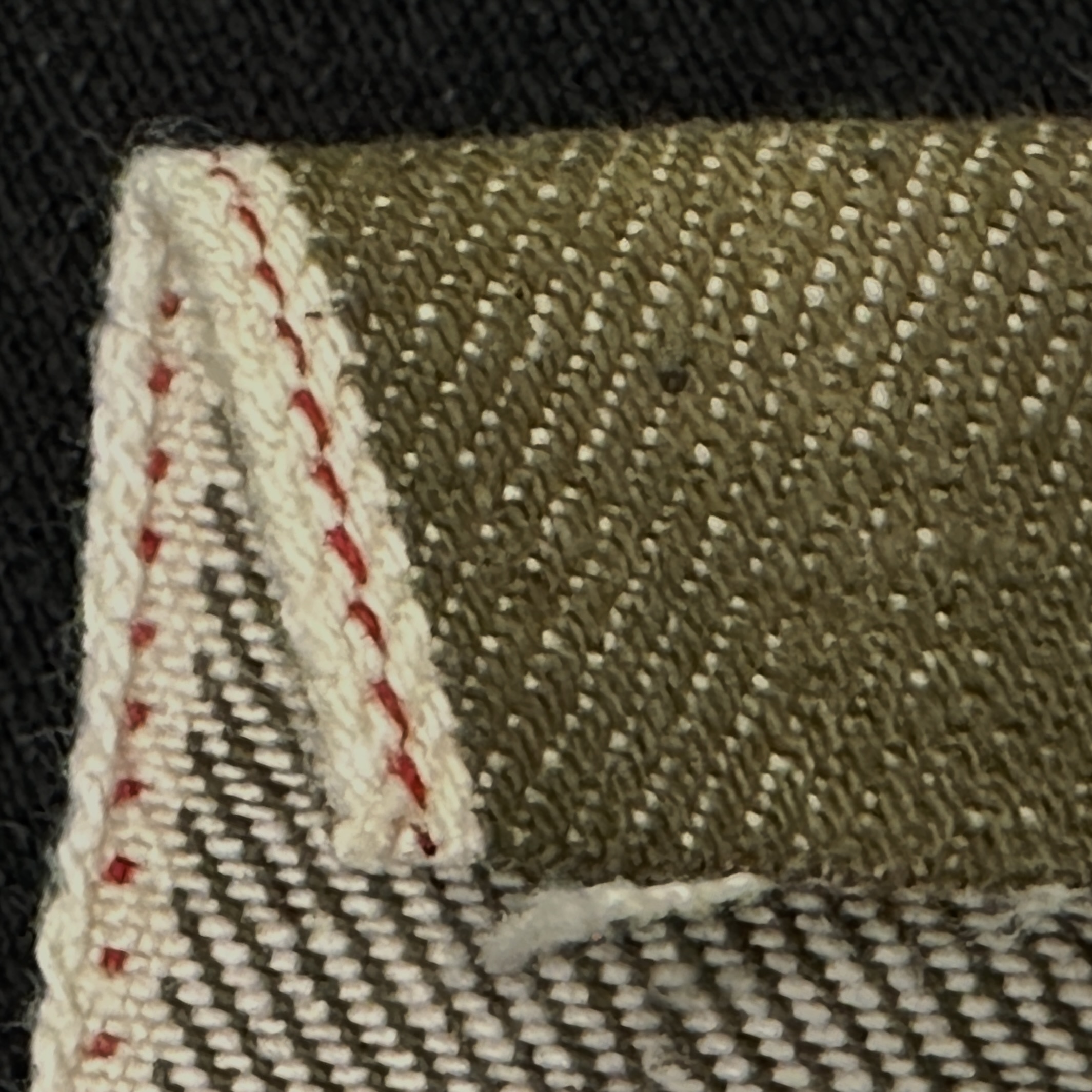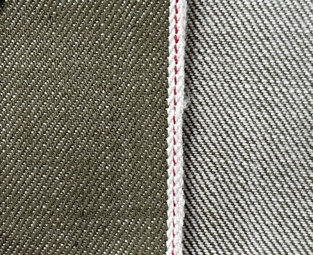 オリーブグリーンのデニム。緯糸は紺糸という凝った作りです。