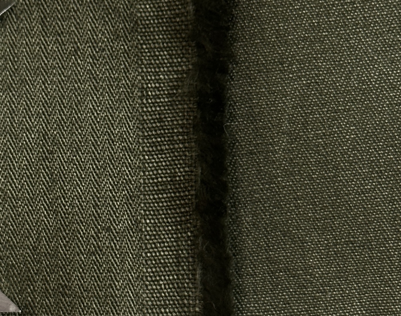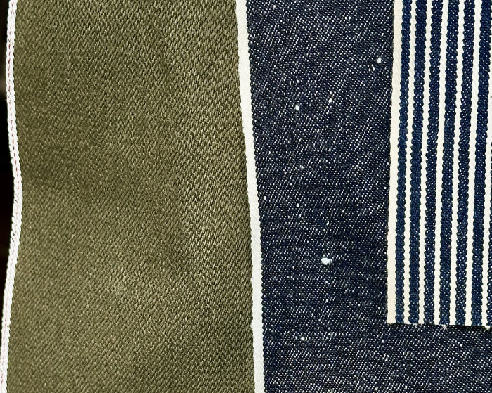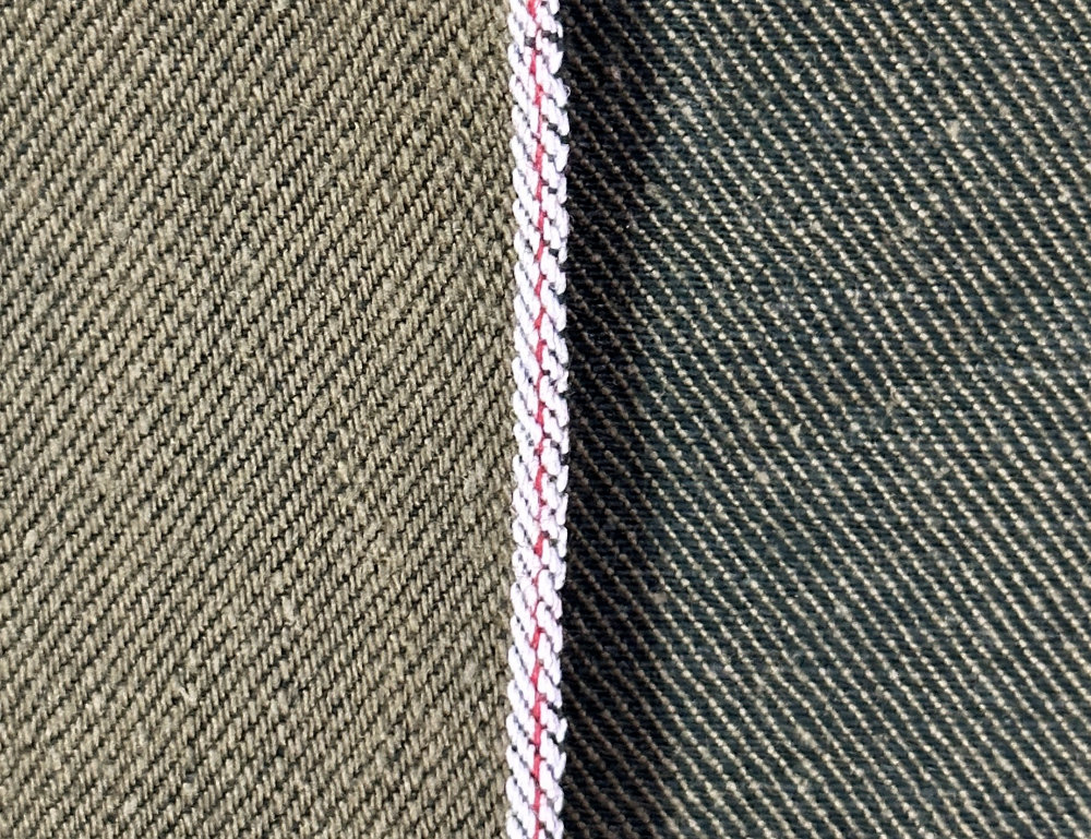 オリーブグリーンのデニム。緯糸は紺糸という凝った作りです。