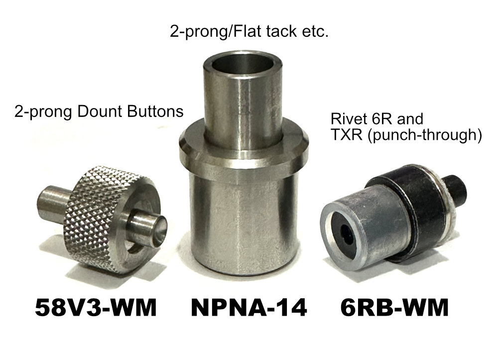 オープントップ(ドーナツ)ボタンのほとんど、リベット6Rタイプ、加えてパンチスルー(打ち抜き)リベット(一部を除く)を取り付け可能です。詳しくはお尋ね下さい